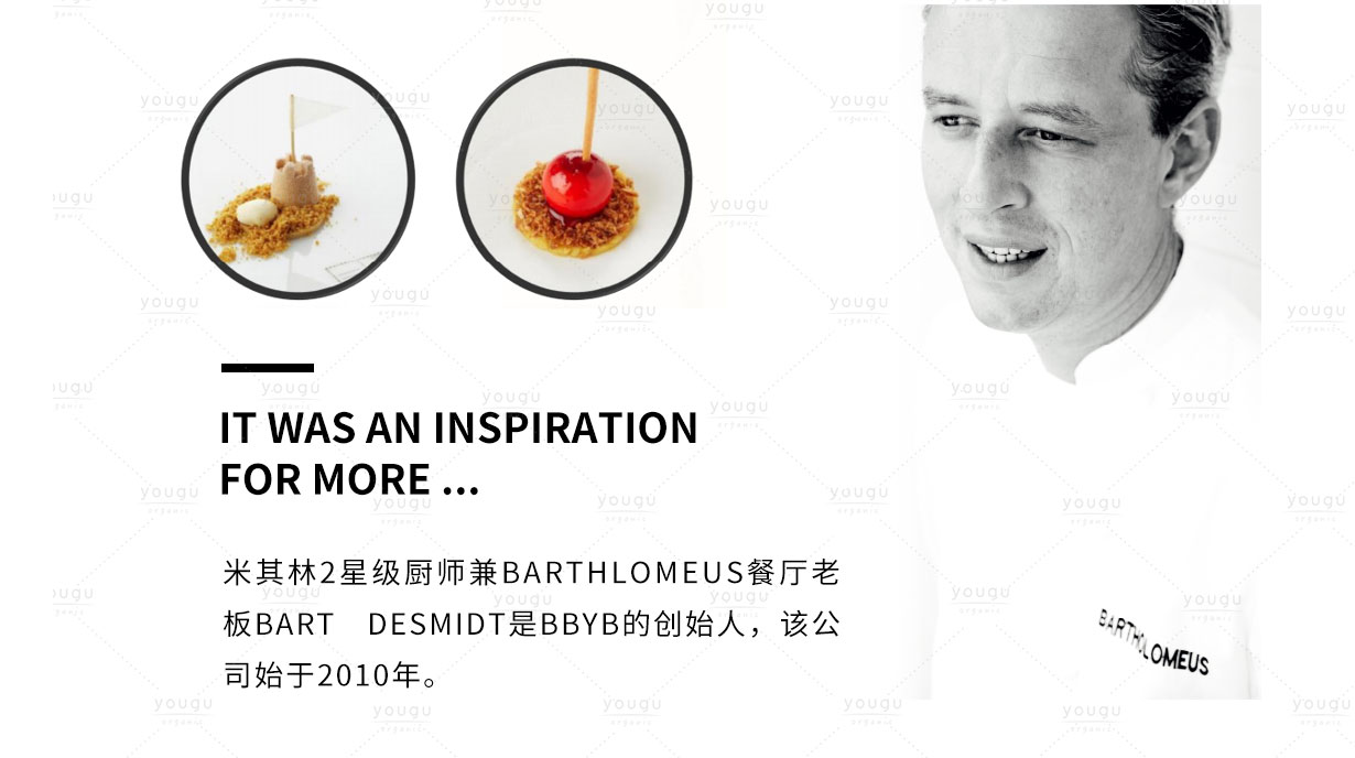 • 诞生于Bart Desmidt的激情和Jan Verleye的工艺。开始Bartholomeus是很受欢迎的甜点之一,后来发展成为BbyB:果仁糖、鲣鸟、Babeluttes和其他高品质的糖果,以创造性和精致性吸引味蕾。