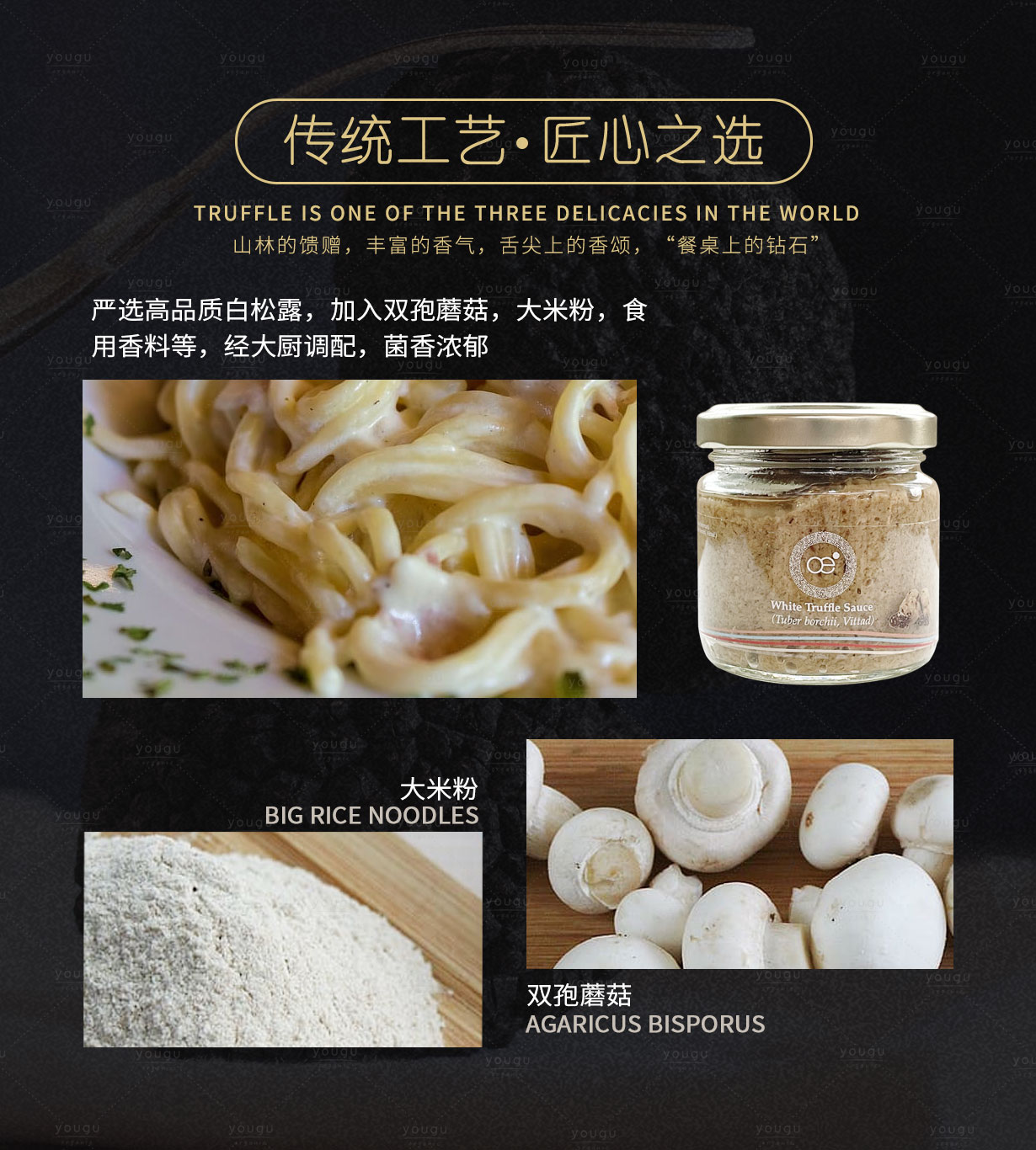 意大利原装进口,白松露,加入双孢蘑菇,大米粉,食用香料等,菌香浓郁,可用于烹煮意大利面、制作牛排、海鮮料理的酱汁等搭配。