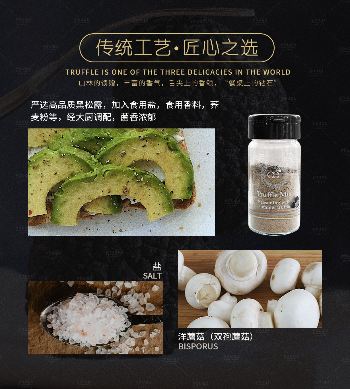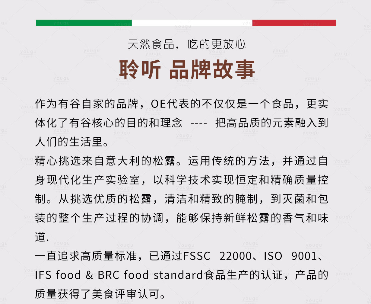 意大利原装进口,松露,加入食用盐,食用香料,荞麦粉等,菌香浓郁,可用于烹煮意大利面、制作牛排、海鮮料理的酱汁等搭配。