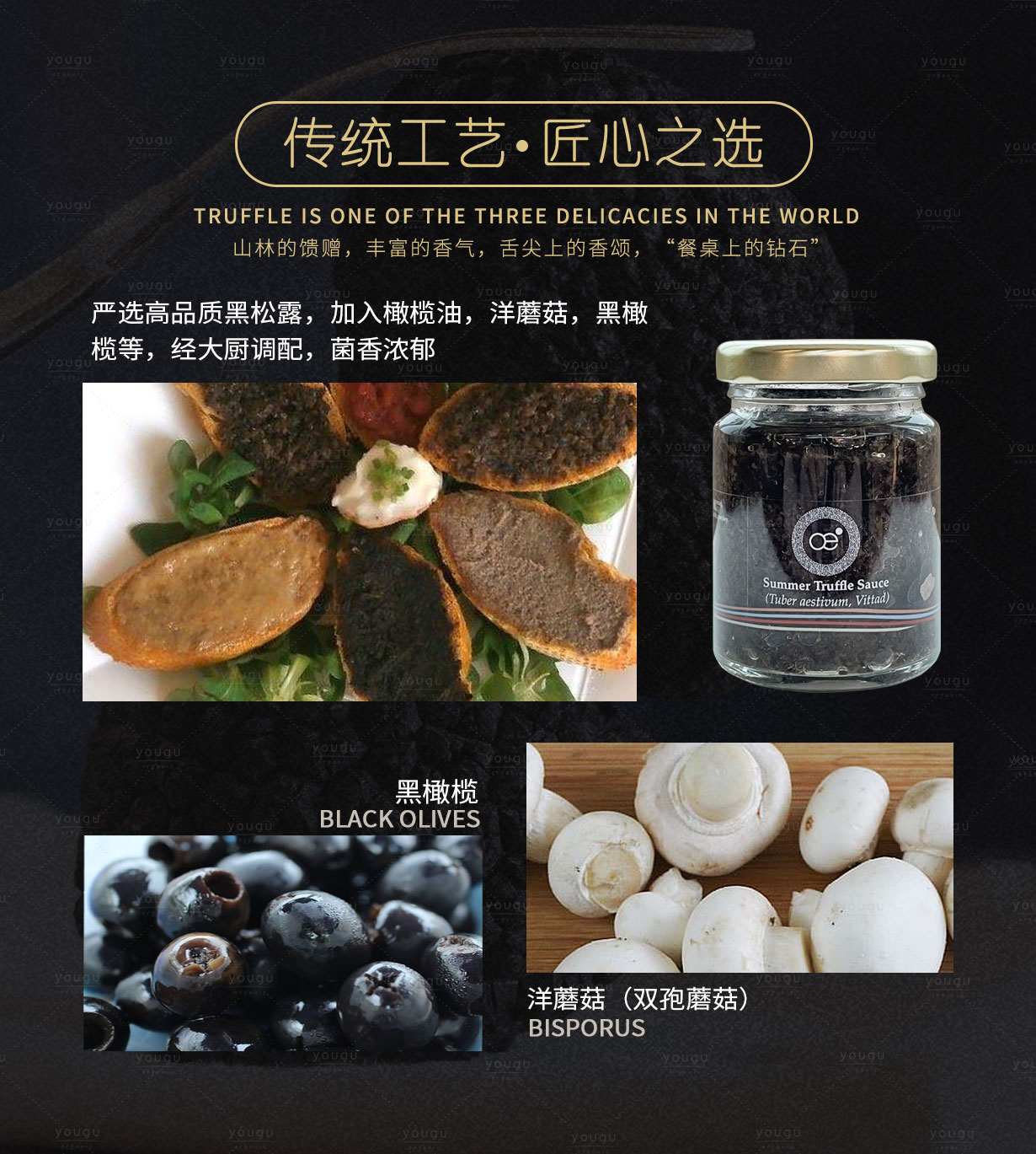 意大利原装进口,黑松露,加入橄榄油,洋蘑菇,黑橄榄等,可用于烹煮意大利面、制作牛排、海鮮料理的酱汁等搭配。