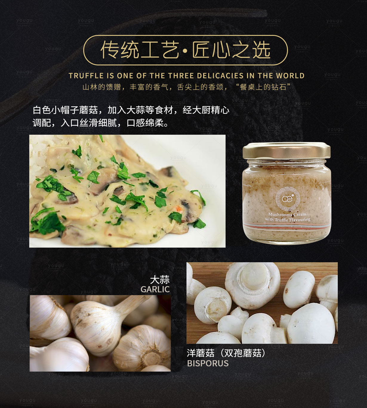 意大利原装进口,白色小帽子蘑菇,加入大蒜等食材,入口丝滑细腻,口感绵柔。可用于烹煮意大利面、制作牛排、海鮮料理的酱汁等搭配。