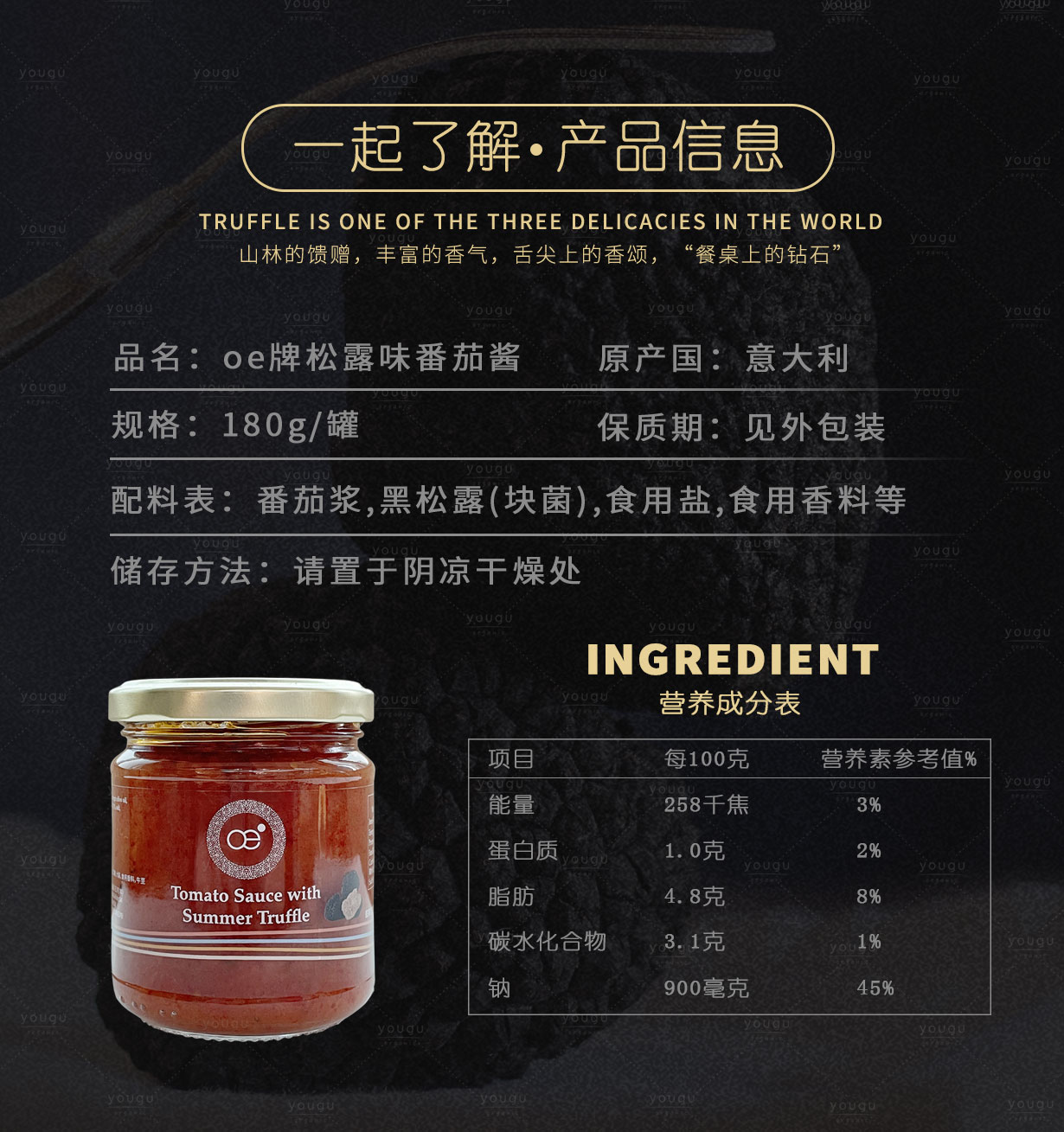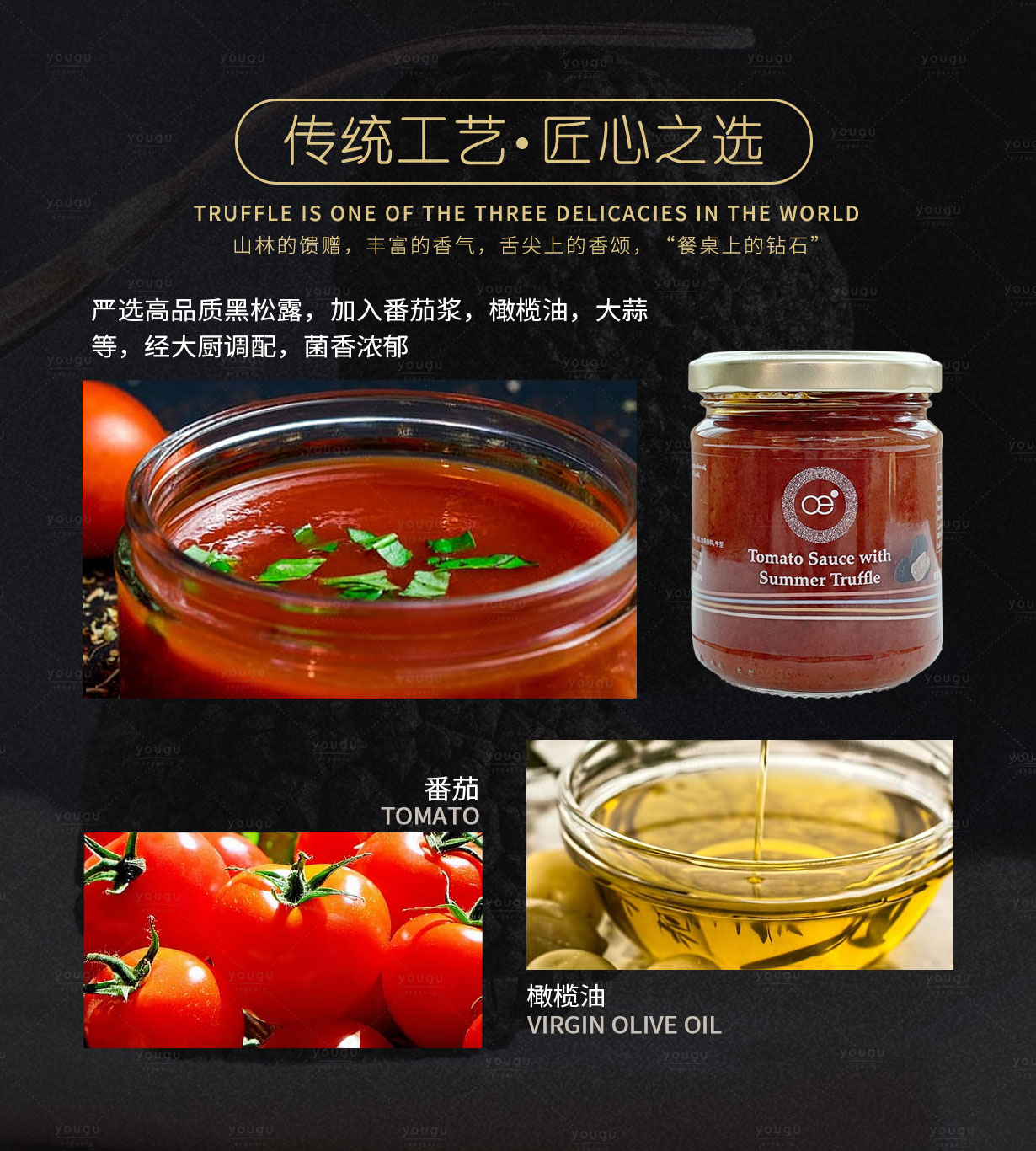 意大利原装进口,松露,加入番茄浆,橄榄油,大蒜等,可用于烹煮意大利面、制作牛排、海鮮料理的酱汁等搭配。