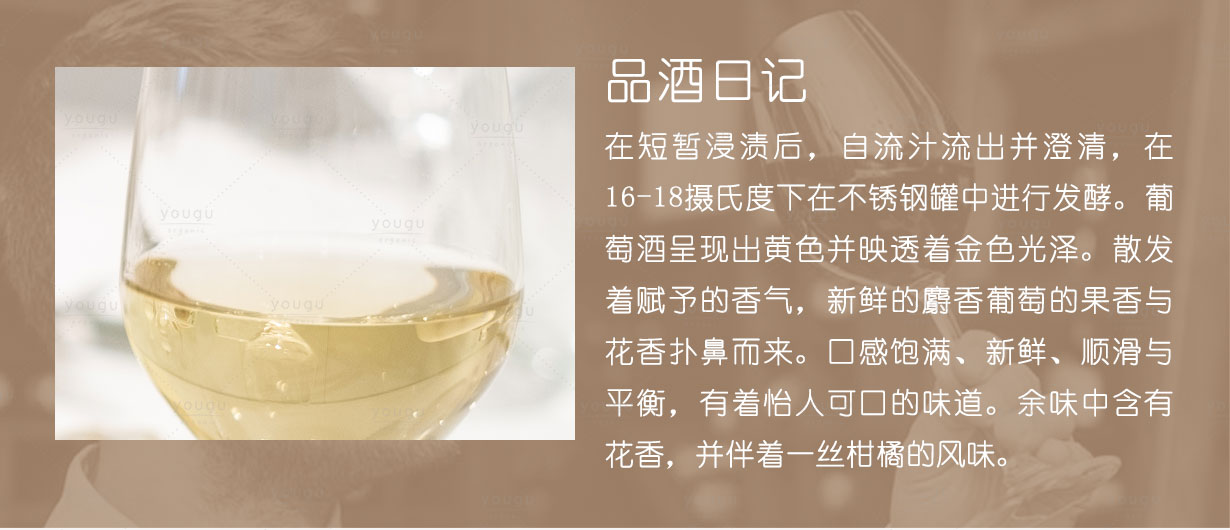 葡萄酒呈现出浓烈的黄色并映透着金色光泽。新鲜的麝香葡萄的果香与花香扑鼻而来。口感饱满、新鲜、顺滑与平衡,有着怡人可口的味道。余味中含有花香,并伴着一丝柑橘的风味。