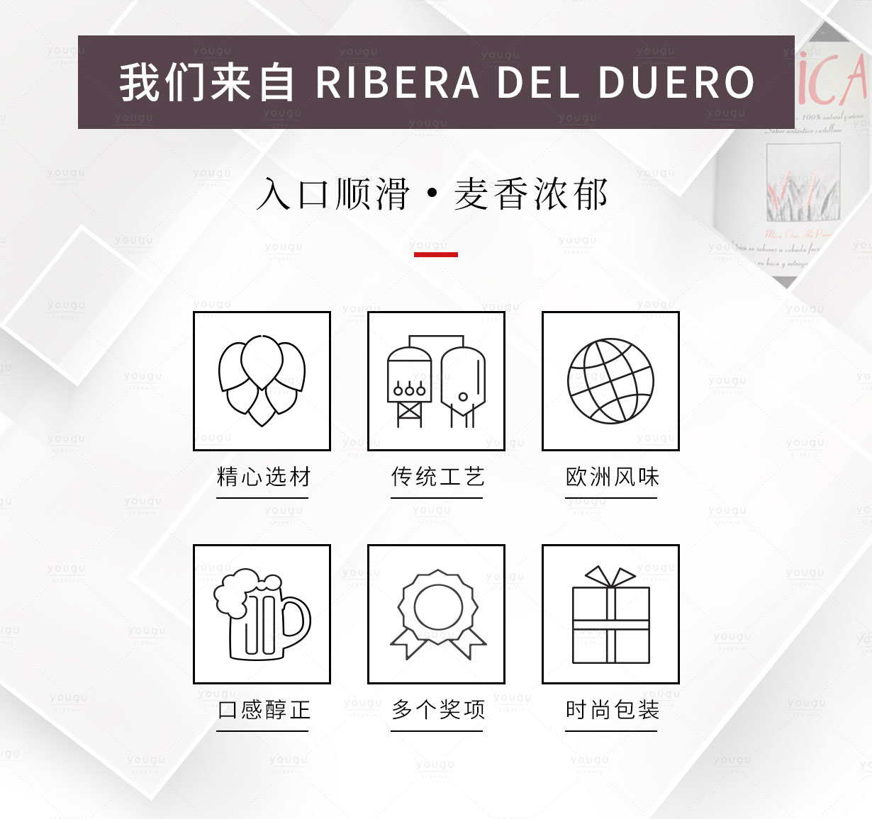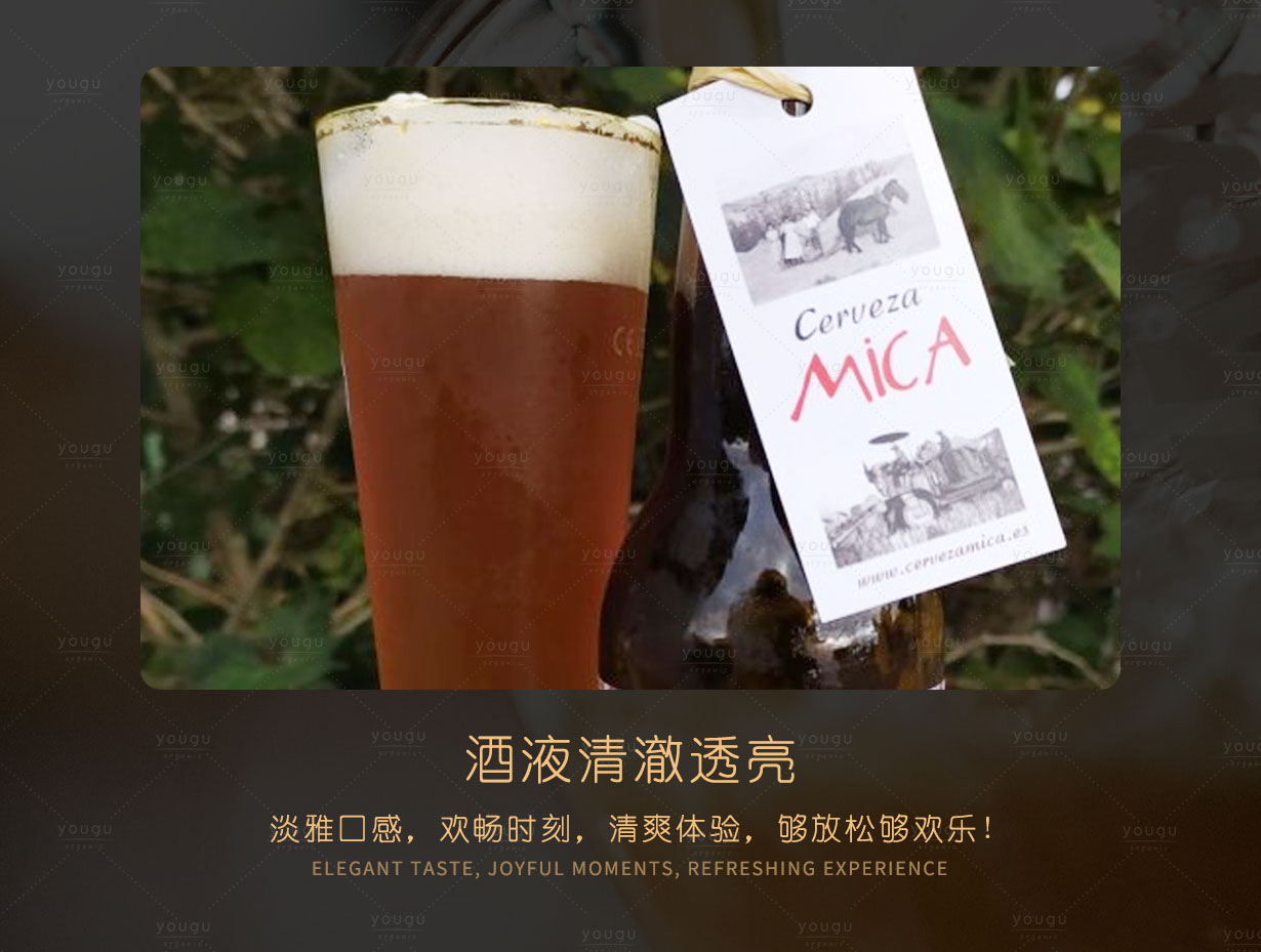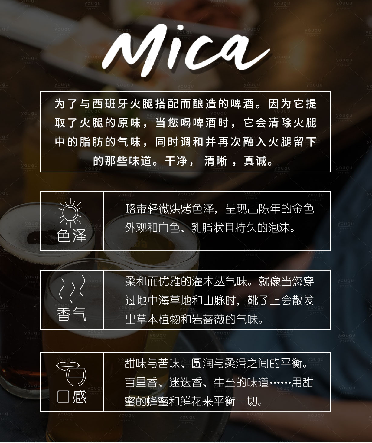 西班牙原装进口,为了与西班牙火腿搭配而酿造的啤酒。因为它提取了火腿的原味,当您喝啤酒时,它会清除火腿中的脂肪的气味,同时调和并再次融入火腿留下的那些味道。干净, 清晰 ,真诚。